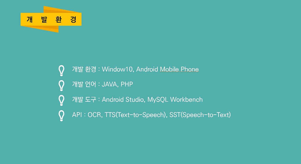 사용언어 및 개발 환경 : JAVA, PHP, MySQL, Android Studio, FileZilla, phpMyAdmin, Google Cloud Vision, Google Text-to-Speech, Google Speech-to-Text API
