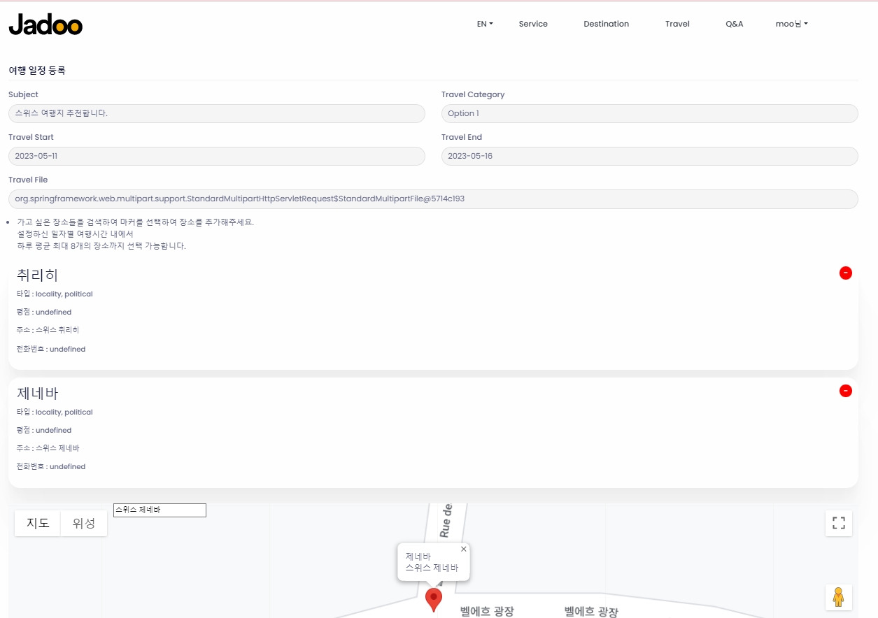 Google Maps API를 사용하여 여행지명을 검색하기만 하면 해당 여행지의 정보가 자동으로 등록됩니다.